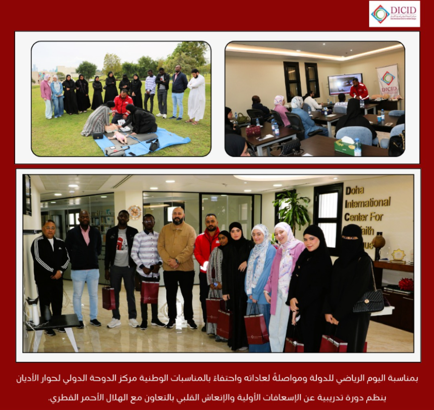 مناسبة اليوم الرياضي للدولة الموافق لـ 10 فبراير 2026، وفي إطار مواصلته لنهجه المؤسسي الراسخ في الاحتفاء بالمناسبات الوطنية ودعمها، وانطلاقًا من رؤيته الشمولية التي تربط بين القيم الدينية ومتطلبات الحياة المعاصرة، نظم مركز الدوحة الدولي لحوار الأديان، بالتعاون مع الهلال الأحمر القطري، دورة تدريبية في الإسعافات الأولية والإنعاش القلبي الرئوي (CPR)، تحت شعار: "تعاليم الأديان تحث على الحفاظ على الصحة والأمن والأمان."
