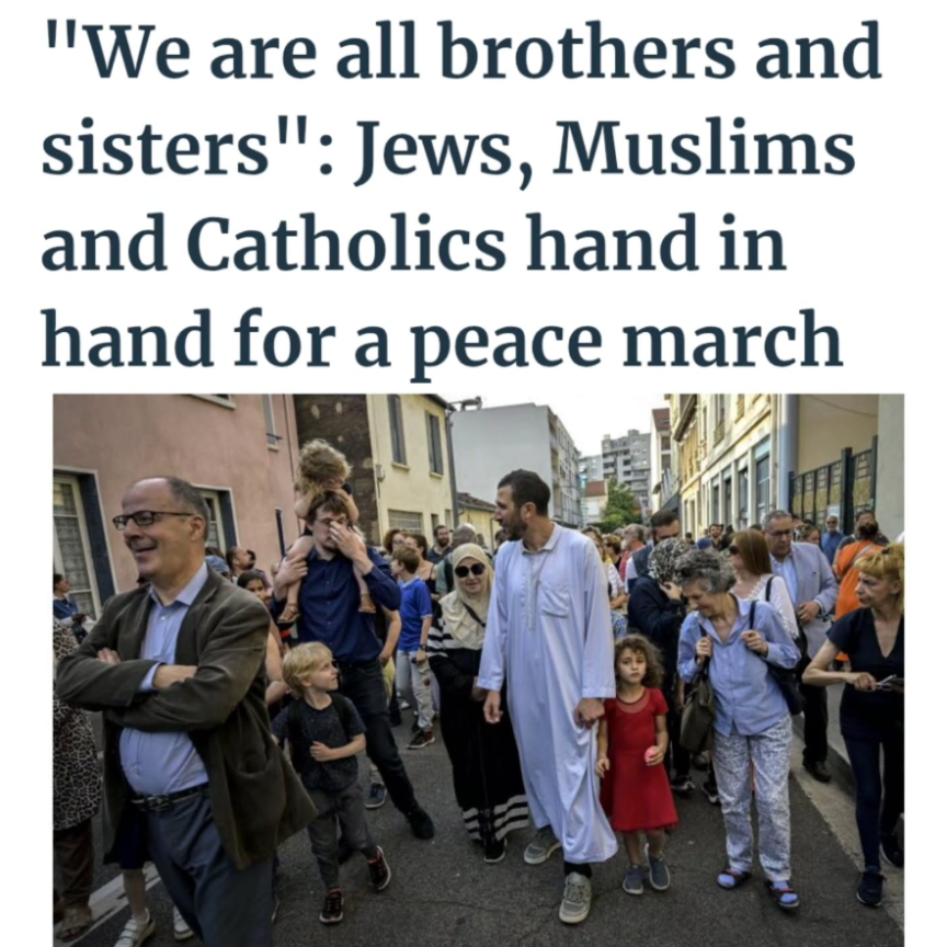 Around 200 people responded to the call from three leaders of Muslim, Jewish, and Catholic places of worship in the Gratte-ciel district of Villeurbanne. The initiative was intended to be "civic, apolitical, and peaceful, undertaken by believers." Along the way, there were many encounters. Side by side, Djillali, a Muslim, and Philippe, a Jew, are talking. They walk in step, sharing stories of their origins. Just a few minutes ago, they were strangers. They came, one from a neighboring district, the other from further away than the metropolis, as members of the Errahma mosque and the Keren or synagogue. Djillali grew up in a family that always lived alongside people of other religions and cultures. "We are the enemy of what we don't know. We must meet. These are communities of peace. There is a problem in the Middle East, but this is France." Philippe attends all the gatherings, "We cannot let this hatred escalate." They clearly heeded the invitation from Nabil Bouslama, head of the Errahma mosque, to mingle and talk with strangers. They were not alone. Many encounters took place within the procession. Eighteen - year-old Nassim came with his mother, 53-year-old Sabah. "A woman came to see me, and we talked about religion." Sabah wanted "to share the three cultures, especially right now." The Gratte-ciel district was recently affected. Early Monday morning, June 2nd, a man broke into the Errahma mosque and burned a Quran . In the outcry this act provoked, the priest of the neighboring parish, Father Olivier de Gersigny of the Church of Sainte Madeleine, expressed his support for Nabil Bouslama. A Dominican monk came to present him with a Quran.